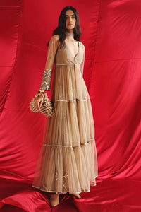 The Taupe Net Layered Anarkali Jacket is an exquisite blend of tradition and elegance. Rendered in a stunning taupe hue, this statement piece is adorned with intricate Mirrorwork embroidery, enhancing its regal appeal. Crafted from luxurious net fabric, its layered Anarkali silhouette adds depth and movement, creating a graceful and sophisticated look.