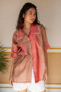 Featuring Taupe Pink Tokyo Shirt from URAIB's collection Summer Lovin'. The product is made from 100% cotton chanderi highlighing a pocket detail on the shirt along with intricate detailing on the collar & sleeves.