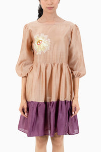 Featuring Taupe-Purple Groot Dress by URAIB from The Forest Affair Collection. Meticulously crafted from Chanderi fabric, this embroidered dress in Taupe-purple shade, it exudes timeless elegance, making it a versatile and stylish addition to your wardrobe.