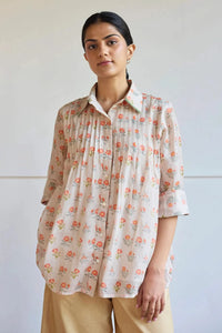 Introducing the Chanderi shirt, a beautifully relaxed-fit piece handwoven with care. Adorned with delicate florette prints that evoke the essence of blooming flowers, this shirt features a verdant green border along the collar and cuffs, adding a touch of nature's charm to every thread.