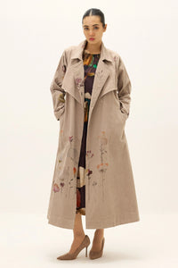Cut in soft corduroy, the Taupe Trench Coat brings together classic tailoring and artisanal detail. Its longline silhouette is finished with a wide notched lapel and relaxed shoulders, making it ideal for layering. Delicate floral motifs, rendered in painterly strokes across the front, sleeves, and back, add a subtle yet striking accent.