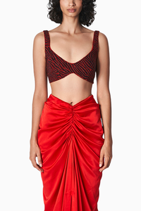 The Tea Blouse is that classic sexy blouse you need in your wardrobe. It is hand embroidered with small beads of red and black color . Designed with a deep V neck and a curved shaped hemline. Closes at the side with concealed zip, it works as a great option to either wear with your saris or with pants for a cool modern look.
