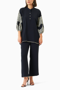 Elevate your style with our Dark Blue Cherry Crepe Tunic Coord Set, featuring exquisite lace appliqué work and delicate lace trimming. Crafted from luxurious crepe, this chic ensemble offers a flattering fit and effortless comfort. The rich dark blue hue and charming cherry print create a vibrant look, perfect for any occasion. Embrace elegance and sophistication with this beautifully designed coord set that effortlessly transitions from day to night.
