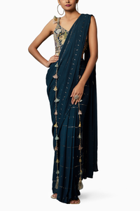 Featuring Teal Blue Embroidered Choli With Pre-Stitched Saree.