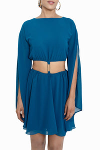Featuring Teal Blue Hazel Dress by Kiran Gupta Label. Elevate your style in this playful skater dress that comes with a boat neck, and side cut-outs and is further adorned by a metal buckle on the waist.