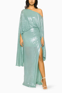 The Mabel gown from Deme by Gabriella should be reserved for the most glamorous occasions. Tailored from sequin fabric the full-length silhouette is topped with a teal one-shoulder gown in sequins base with a side slit. Complete the look with pointed heels.