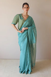 Like wildflowers swaying in a twilight breeze, the Teal Wildflower Meadow Jamdani Saree captures the quiet rhythm of nature.