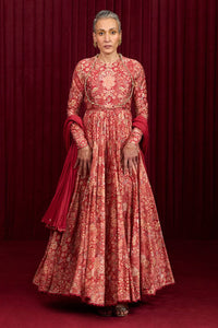 Featuring the Tempo Anarkali Set from Ridhi Mehra's Jazz-A-Jashn Collection. This enchanting ensemble includes a red printed Chanderi Anarkali paired with a crushed mulmul dupatta, creating a complete and stunning look. Perfect for any festive occasion, it exudes elegance and grace!