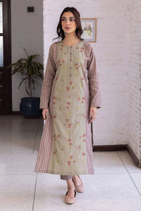 Crafted from handwoven cotton in subtle stripes, the kurta features delicate floral hand embroidery down the front. It is complemented by full sleeves, and a softly structured silhouette with decorative seams. The matching striped handwoven cotton pants complete the look with ease and grace.