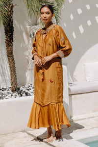 Midi dress crafted from muslin silk features hand smocking and embroidery on the neckline and sleeves, a midi hemline and embroiderd motifs all over the dress.