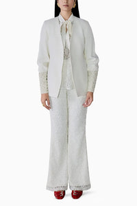 Featuring blazer set with emblished pearl cuffs paired with sheer lace top with satin rope around and bootcut pants