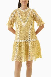 The Terra shirt dress is brought to life through this season's hottest shade. Featuring lace-detailing, an open neck, puff sleevs and hand embroidered flower embellishments throughout.