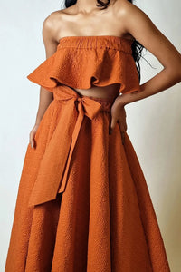 The top hung around her like a flower that opened up to the ground. It was layered - the inside was a smocked bra that hugged her chest the outside was a floating wave of fabric that held its form around her frame. Quilted with matching thread, the crop top felt like a dream could wear throughout the day