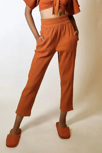 Cropped and breathable, the pants looked like they were part of her. The ruched elastic sculpted her waist, the pockets allowed her to move without a purse and the rippled fabric had a texture that must have felt like being in a shower of raindrops. I wondered if she had an extra pair she'd let me borrow for the vacation.