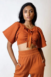 Fun and comfort were the most important factors for her when she picked new clothes. This reversible top had flared sleeves that were longer than the smocked cropped bodice. Regardless of how she wore it - with the bow drawstring in the front or the back - the top made her feel like a butterfly, with wings that spanned across her body.