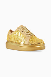 Our Terrazzo classic sneakers are crafted in shimmery gold fabric and adorned with a detailed composition of acrylic mirror work in gold. The abstract geometric patterns are highlighted with gold cutdana embroidery from the comfortable sneaker heel to its rounded toe.