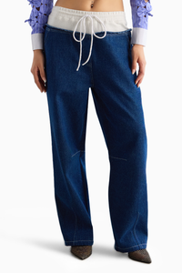 Featuring the Terry & Denim Jeans by MellowDrama's by Utopia Collection. Crafted from 100% cotton, these slip-on jeans combine terry and denim materials for comfort and style. They feature an elasticated waistband with a drawstring, front and back pockets, contrast stitching, and raw edge details. Designed with darted knees and a high waist, they offer an easy fit, perfect for casual wear with a touch of urban flair.
