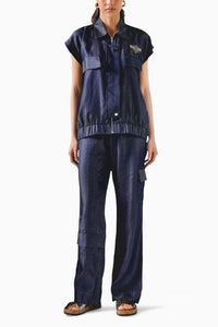 A tencel denim coord with a bomber jacket and cargo pants, featuring pocket detailing for a casual, stylish appearance.