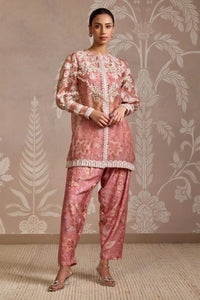 Featuring Tether Coral Print Kurta Set by Ridhi Mehra's In the Folds Summer Collection '25. This chic set includes a printed organza placement embroidered kurta, paired with fine silk pants and a bustier. The vibrant coral print adds a lively touch, combining traditional elegance with modern sophistication for a stunning ensemble.