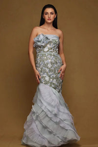 This asymmetric textured gown is beautifully engineered using soft tulle and an organza base, creating a graceful, ethereal silhouette. The gown is adorned with intricate floral vine embroidery, adding a touch of nature-inspired elegance. A crystal belt cinches the waist, enhancing its refined structure, while an organza drape resembling a rosette adds a romantic, dramatic flourish to the design.