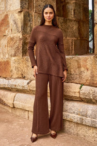 This textured and pleated knit top features a mock neck collar, panelled construction for added structure and movement, and an asymmetric hem for a modern touch. Full sleeves and a contrast black zipper at the back complete the design. Paired with matching wide-legged pants, which have an elasticated waist and side zipper, this set offers a stylish and comfortable look, perfect for any occasion.