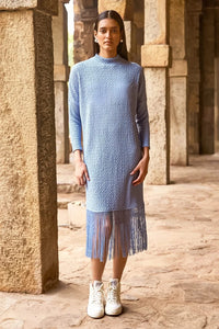 This textured and pleated knit dress features playful fringes at the bottom hem for a unique touch. With a mock neck, full sleeves, and a relaxed fit, it offers both comfort and style, making it a versatile addition to your wardrobe.