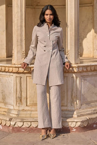 Textured luxurious longline jacket in a delicate floral pattern. Band collar, overlapping front, with placed matte metal button closure and side slits. Full sleeves.Paired with matching textured luxurious straight cut pants in a delicate floral pattern. Front matte metallic button and zip closure. Pockets on the sides, belt loops on the waist.