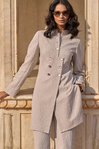 Textured luxurious longline jacket in a delicate floral pattern. Band collar, overlapping front, with placed matte metal button closure and side slits. Full sleeves.
