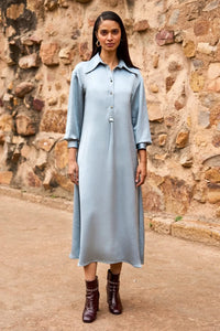 This relaxed A-line shirt dress is crafted from soft, flowing textured satin for a luxurious feel. Featuring a classic shirt collar, full sleeves with long cuffs, and gold buttons on the front placket and sleeve cuffs, it combines effortless elegance with modern sophistication for a chic, versatile look.