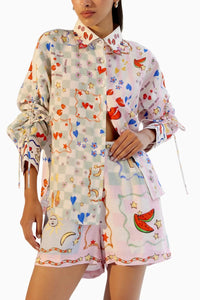 The Thais Shirt, a beloved bestseller from our previous collection, makes its return in two stunning new variations. Crafted for versatility and charm, it is available in Boardgame, featuring vibrant placement printing on linen lyocell with intricate collar and cuff embroidery, and a timeless All-Over Embroidery design on breathable giza poplin. Both styles feature adjustable drawstrings on the sleeves, creating a chic ruching effect that adds a touch of playfulness to its classic silhouette.