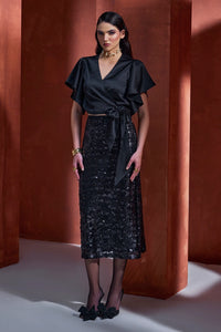 Featuring The Alia Black Co-ord Set by Bohochic's Lumiere Collection. Crafted in 100% satin silk with a sequinned skirt, this black ensemble features a wrap blouse with flutter sleeves, delivering a classic, elegant look for refined celebrations.