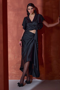 Featuring The Amure Black Draped Co-ord Set by Bohochic's Lumiere Collection. Exquisitely crafted in 100% heavy satin silk, this black ensemble pairs a draped skirt with a wrap blouse, delivering luxurious texture and sophisticated, modern elegance.