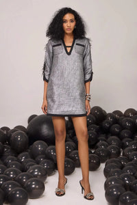 This striking silver shimmer A-line dress features a stylish V-neck and two pockets just below the shoulders, adding both practicality and flair. The three-fourth sleeves are beautifully adorned with feather detailing on the sides, creating a chic and elegant touch. Perfect for making a glamorous statement at any occasion.