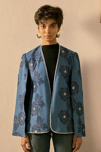 A charming denim cape featuring intricate, tonal floral appliqué and embroidery, finished with delicate Shiny Pearl lace trim.Perfect for layering over a simple dress or top.
