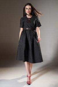 Discover the understated elegance of our Black Jacquard Bow Dress. The embossed jacquard fabric adds a touch of texture, while the round neckline adorned with handmade bows and red Swarovski crystals creates a captivating focal point. The A-line silhouette, featuring a fitted waist and pleated skirt, flatters every figure. With side pockets for added functionality, this dress is both stylish and practical.