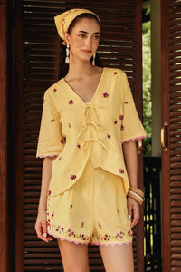 This co-ord set showcases all-over French knot embroidery, front ties, and contrasting scallop lace detailing. Combining delicate craftsmanship with modern styling, it creates a fresh and feminine ensemble ideal for brunches, garden parties, or warm-weather occasions.