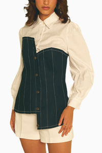 Features The Caprese Blouse by Boho Chic from Love Cabo Collection. Crisp white shirt with an overlay of a denim button down and contrast stitching.