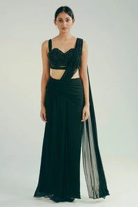 Bustier blouse with micro-draping embroidery on neckline and abstract bead, sequin and crystal embroidery on body. Curved hem with tulle cutouts and gathered straps. Centre back hook & eye opening. Saree skirt with beading on shoulder drape. Side seam conceal zipper opening.