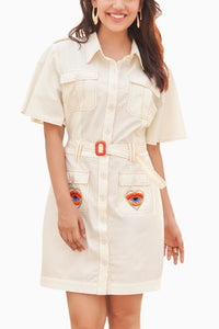 Discover a unique take on classic elegance with our Shirt Dress featuring eye-catching embroidered pockets. Adorned with heart evil eye motifs, crafted in colorful beads and threads, this dress offers a vibrant twist. The contrasting orange stitch lines provide a striking detail, elevating this piece from simple to sensational. Perfect for adding a playful yet sophisticated touch to your wardrobe.