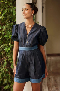 This classic denim playsuit features contrast gold buttons and detailed denim trims, creating a chic and comfortable look. Perfect for warm weather, it transitions seamlessly from day to evening, offering effortless style with a modern edge.