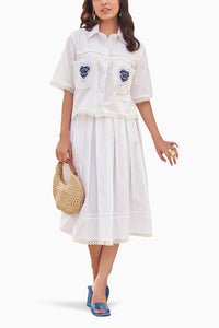 This sophisticated ensemble features a crisp white skirt paired with a matching top, making it a perfect choice for both casual and semi-formal occasions. The top is a button-down shirt with a classic collar, elegantly embroidered with beautiful heart motifs that contain protective evil eyes. Delicate lace details enhance the charm and femininity of the top, adding a touch of elegance. The white skirt complements the top perfectly, creating a cohesive and stylish look. Pair this set with your favorite heels or flats for a polished and chic outfit.