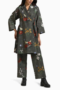 This is a set of two featuring wrap style tunic in a 'kalidar' inspired silhouette paired with straight trousers. The trouser has an elasticated waist and a tie-up for extra comfort.