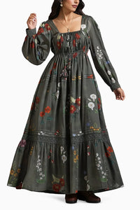 A printed maxi dress that comes in a flattering and feminine silhouette. It features a wide square neckline with an adjustable tie-up, and the bodice is gathered with elastic for an easy and comfortable fit. The delicate lace detail accentuates the piece.