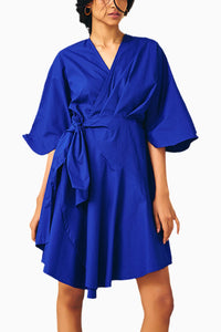 Elevate your wardrobe with our electric blue wrap dress, crafted from lightweight poplin. This striking dress features bell sleeves with embroidered hemline details and a front tie-up for a customizable fit. Perfect for a touch of vibrant sophistication.