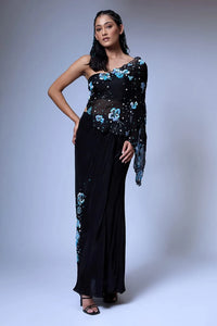 Organza one-shoulder tie-up cape embroidered in 3D floral burst embroidery. Paired with a draped skirt with hints of same embroidery and a bustier blouse to be worn inside.
