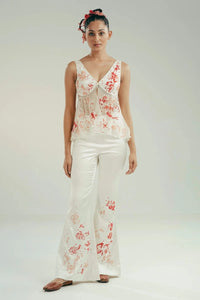 Jacket top with silk organza panel and 3D floral embroidery. Centre front hook and eye opening. Fit and flare pant with floral embroidery. Side seam conceal zipper opening.