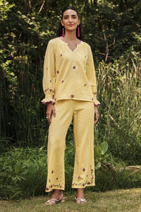 Delicately hand-embroidered with timeless French knot roses on the blouse and pant hems, accented with contrasting scallop lace. This elegant matching co-ord set is perfect for a relaxed brunch or stylish afternoon gathering, combining comfort with artisanal charm.
