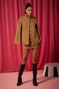 This stunning golden tweed cape showcases charming ruffle detailing at the neck, adding a playful yet elegant touch. The flowing silhouette drapes beautifully, making it a captivating statement piece. Paired with a coordinating mini tweed skirt. This ensemble is ideal for making a stylish impression.