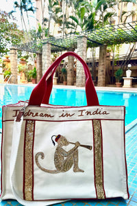 Hand-embroidered in the artisanal traditions of India, in sequin and kasab, the Golden Monkey tunes in style and glamour on a cream canvas base with stunning vermillion red handles. Whispering, ‘I dream in India’.