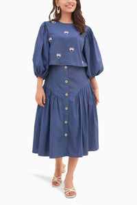 This charming ensemble features a short blue top with playful balloon sleeves, adorned with heart motifs that contain protective evil eyes, adding a unique and stylish touch. The top is paired with a T-length skirt, which is both elegant and versatile. The skirt is detailed with buttons along the front, purely for aesthetic appeal, enhancing its sophisticated design without functional use. This outfit effortlessly combines modern flair with timeless elements, perfect for any casual or semi-formal occasion.